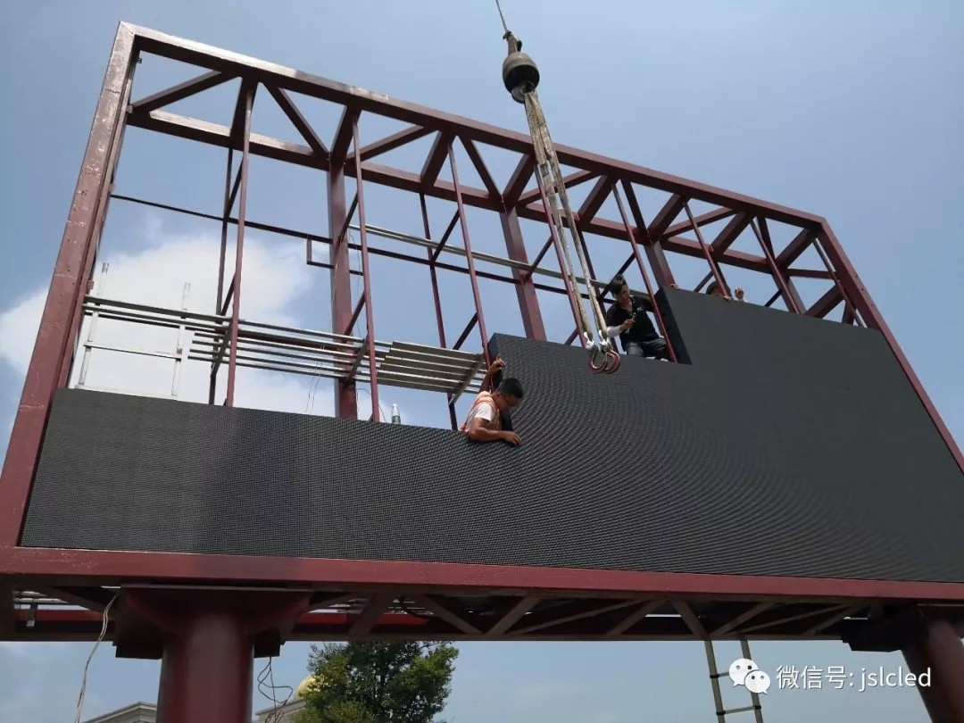 該項目由江蘇亮彩承制,負責該項目的鋼架結構設計施工以及LED顯示屏顯示系統的整體構建。正值盛夏,亮彩工程部也一絲不茍的完成的戶外顯示屏安裝工作,江蘇亮彩團隊始終不斷提升產品卓越性,完善售后服務以保障完美交付每一項顯示屏安裝工程。